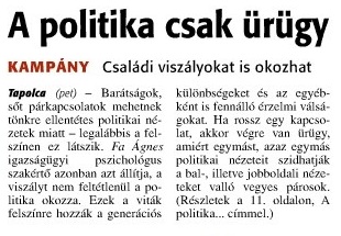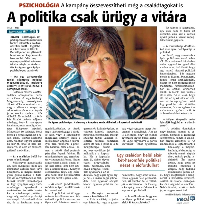 Fa Ágnes igazságügyi pszichológus szerint a politikai viták mögött gyakran nem is a politika áll, hanem generációs különbségek, párkapcsolati gondok vagy személyes sérelmek. A társadalom nagy része alkalmazkodik az aktuális rendszerhez, míg kisebb hányad lázad ellene, vagy dönt valóban önállóan. A politikai ellentétek akár barátságokat, párkapcsolatokat is tönkretehetnek, de sokszor csak ürügyek mélyebb problémákra.
