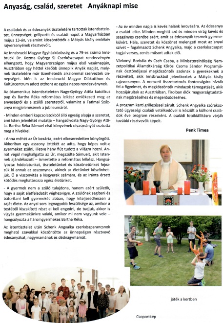 Az innsbrucki Magyarházban anyák napja alkalmából ünnepséget, istentiszteletet, grillpartit és családi napot tartottak a tiroli magyar családok tiszteletére. A rendezvényt az Innsbrucki Magyar Egyházközösség és a helyi cserkészcsapat szervezte. Az ökumenikus istentiszteleten az anyaság és a szeretet fontosságát hangsúlyozták. Díjazták a Mátyás király rajzverseny résztvevőit is.
